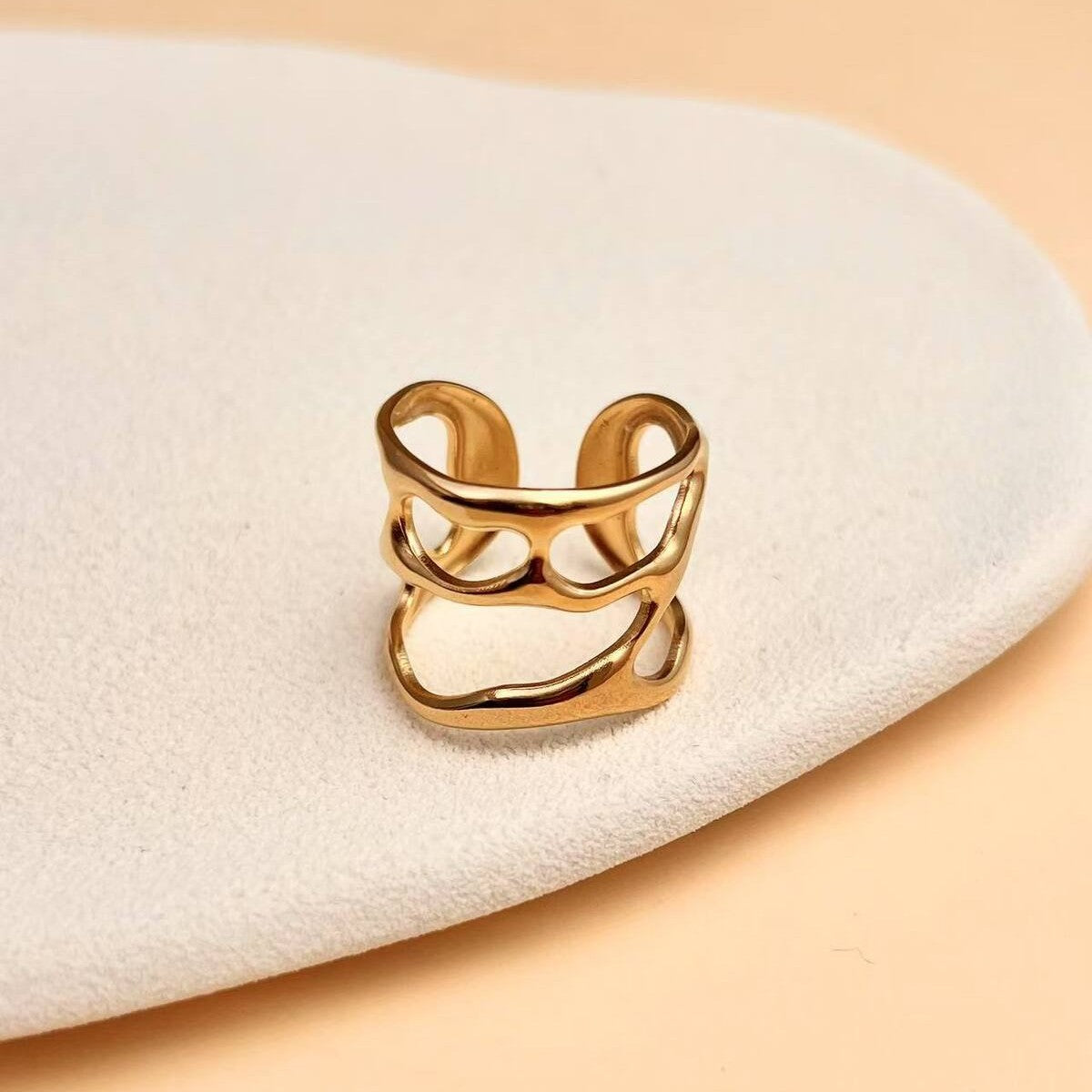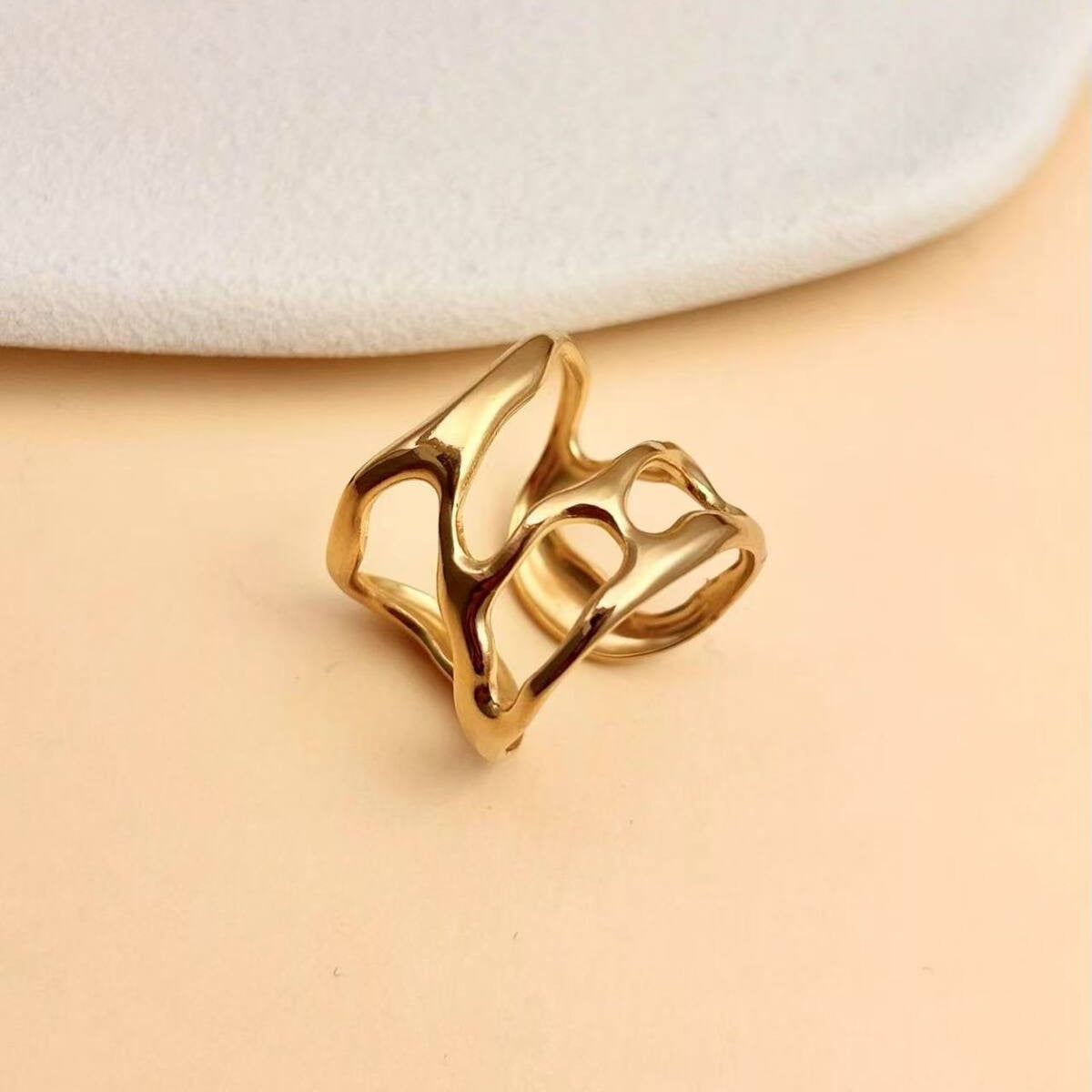 Ein Statement-Piece mit Charakter: Der breite Ring (ca. 1 cm) in Gold überrascht mit spannenden Cut-Outs, die wie organisch geformt wirken. Das Design ist edgy, modern und macht ihn zum perfekten Eyecatcher für deinen Look. Gefertigt aus Edelstahl – wasserfest & nickelfrei.