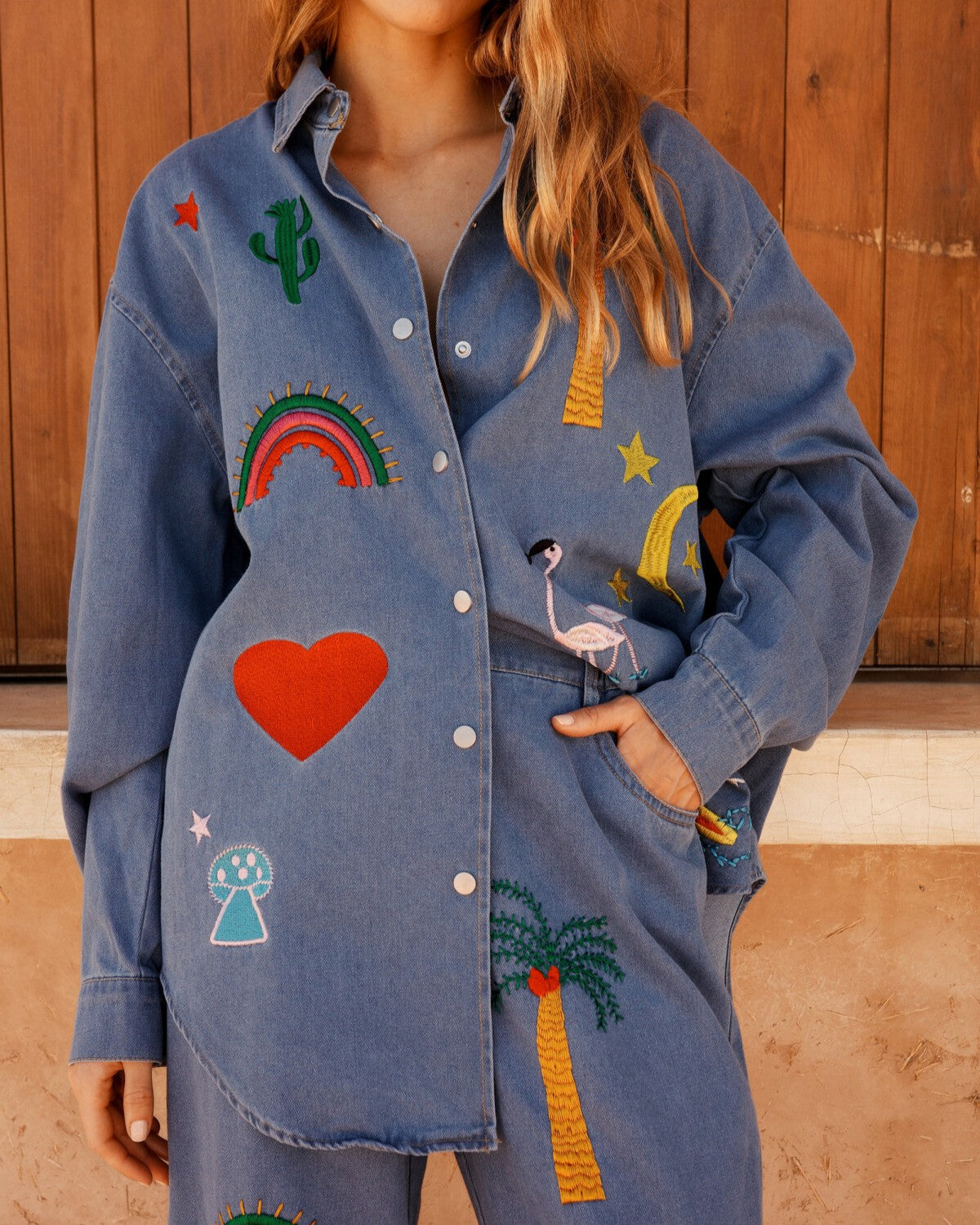 Ein Jeanshemd, das mehr kann: Mit bunten Stickereien bekommt der Klassiker ein farbenfrohes Upgrade. Der lockere Schnitt macht es super easy zu stylen – ob offen über Tops, lässig geknöpft oder als cooles Set mit der passenden Hose. Süß & entspannt zugleich – ein Piece für echte Feelgood-Looks.